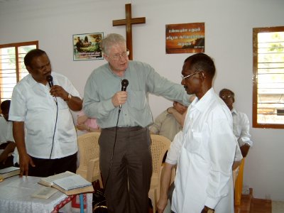 At the end of the Tamil the team prayed for people. It was then off to KFC for a quick lunch before setting off for Krishnagiri for the dedication service of a church that was built with help for KMPC church. It was a 2 hour plus drive over the border into Tamil Nadu to Krishnagiri. Bishop Francis Jackson was the guest of honour. Roger gave words of encouragement to people attending the service and prayed for the church.