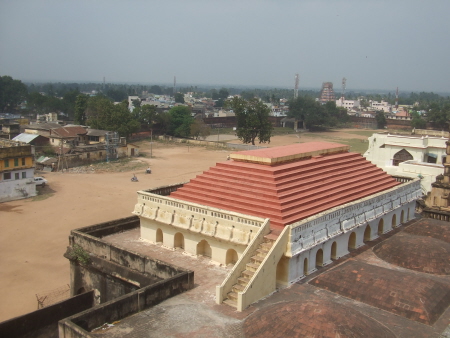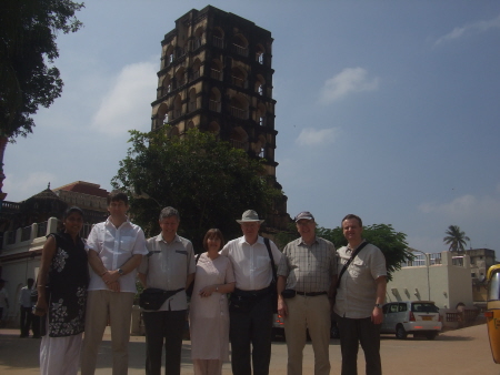 The tour of course started with some shopping in the shop in the Palace grounds. Inside the Palace were many Indian figure statues and exotic decorated ceilings. Roger led his men to the top of a Tower (110 steps) and he led them down again. There were some lovely views of tanjore and the surrounding countryside from the highest point we were allowed access.